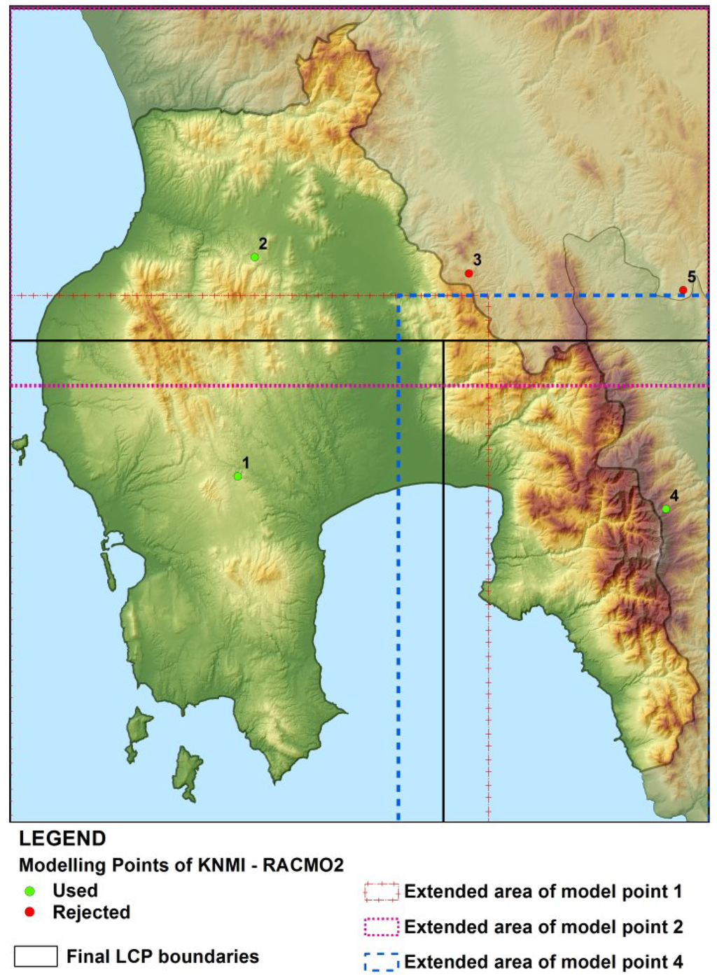 The three selected prediction Points (1, 2 and 4) cover the SW, N and SE parts of Messinia, respectively (Figure 2). The regions corresponding to the area closer to each point were initially derived using the Thiessen polygons calculation method and the results were reformed to parallelogram shapes around each point. Due to the fact that Randig simulations do not expand to no-data cells, areas close to the LCP edges would have unrealistic/error values. To resolve this issue, the derived areas were expanded by 5 km inside Messinia to create three LCP files. Randig results were clipped by the initial defined area and then merged to form the final files of present and future time period simulations.