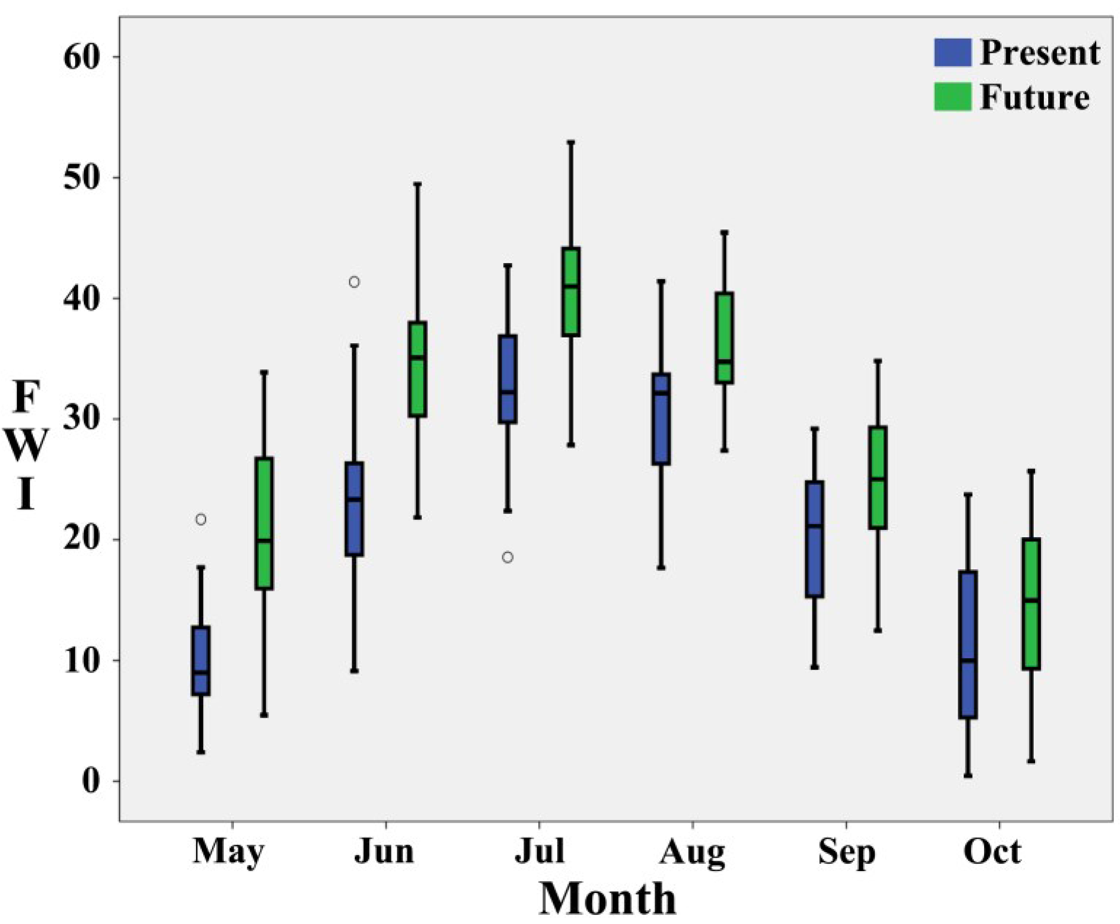 Fire season monthly FWI values for the present (blue) and future (green) time periods.