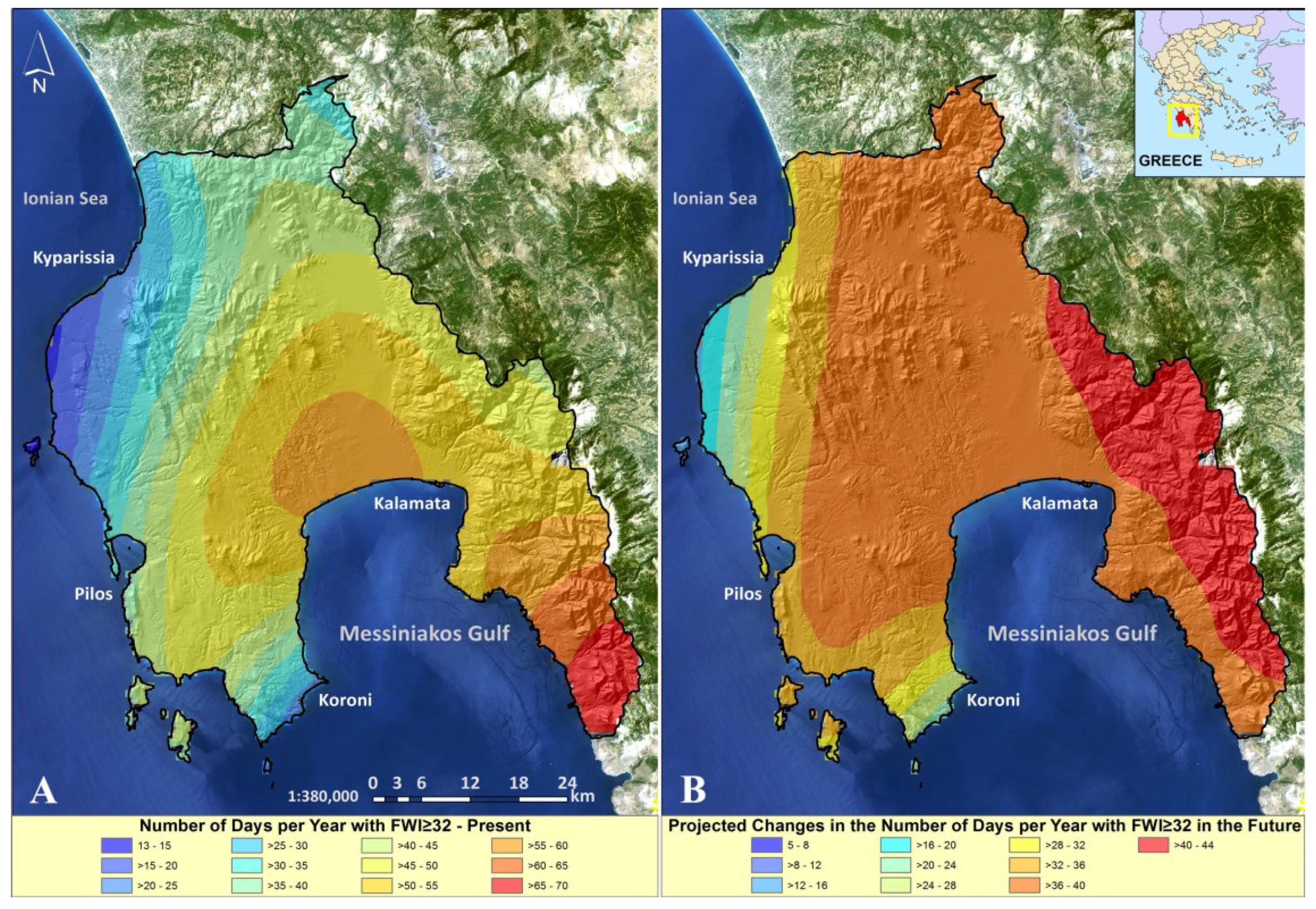 Changes in climate have the potential to significantly affect wildfire frequency, size and intensity; while higher fire risks, longer fire seasons and more severe fire effects are expected [3,4,5,6,7]. Therefore, these possible future changes on wildfire patterns will subsequently increase the risk of wildfire-related hazards and vulnerabilities such as microclimate alteration, floods, destruction of infrastructure, economic losses and human casualties. Many aspects of post-wildfire conditions will affect or accelerate other natural environmental disturbances, resulting in modified vegetation patterns and succession procedures, land degradation, desertification and hydrological cycle derangement. Even gradual and apparently small changes in climate can lead to catastrophic shifts in ecosystems when their resilience has been compromised by human exploitation [8]. Furthermore, carbon and other greenhouse gases emissions from wildfires cause feedback loops on the climate. An unfortunate feedback loop exists where more fires lead to greater emissions of greenhouse gases, leading to conditions increasingly conducive to wildfires [9,10,11]. The vulnerability of the Mediterranean region in anthropogenic climate change for the upcoming decades has been stressed in a number of articles (e.g., IPCC 2013 [12] and references thereafter). The redistribution of rainfall amounts is quite interesting in the complex topography of the Mediterranean in which areas with high precipitation are expected to receive less rainfall, while isolated regions such as the Aegean Sea show much less reduction of rainfall amounts in the future [13,14]. Studies of climate change for the Mediterranean region demonstrate the vulnerability of the area to human-made climate change, associated with a strong increase in temperature and decrease in rainfall [15,16,17,18,19]. Climate change indices for extreme events reveal changes especially in summer temperatures, where both minimum and maximum temperature extremes show statistically significant warming trends [20]. In addition, the number, intensity and length of heat waves were found to increase in the eastern Mediterranean region [21]. Future model predictions have shown that the number of days with maximum temperatures exceeding 35 °C and their total annual number are also expected to increase there [14,22]. Such changes may lead to an increase in the magnitude of forest fire risk in Greece and the eastern Mediterranean region.