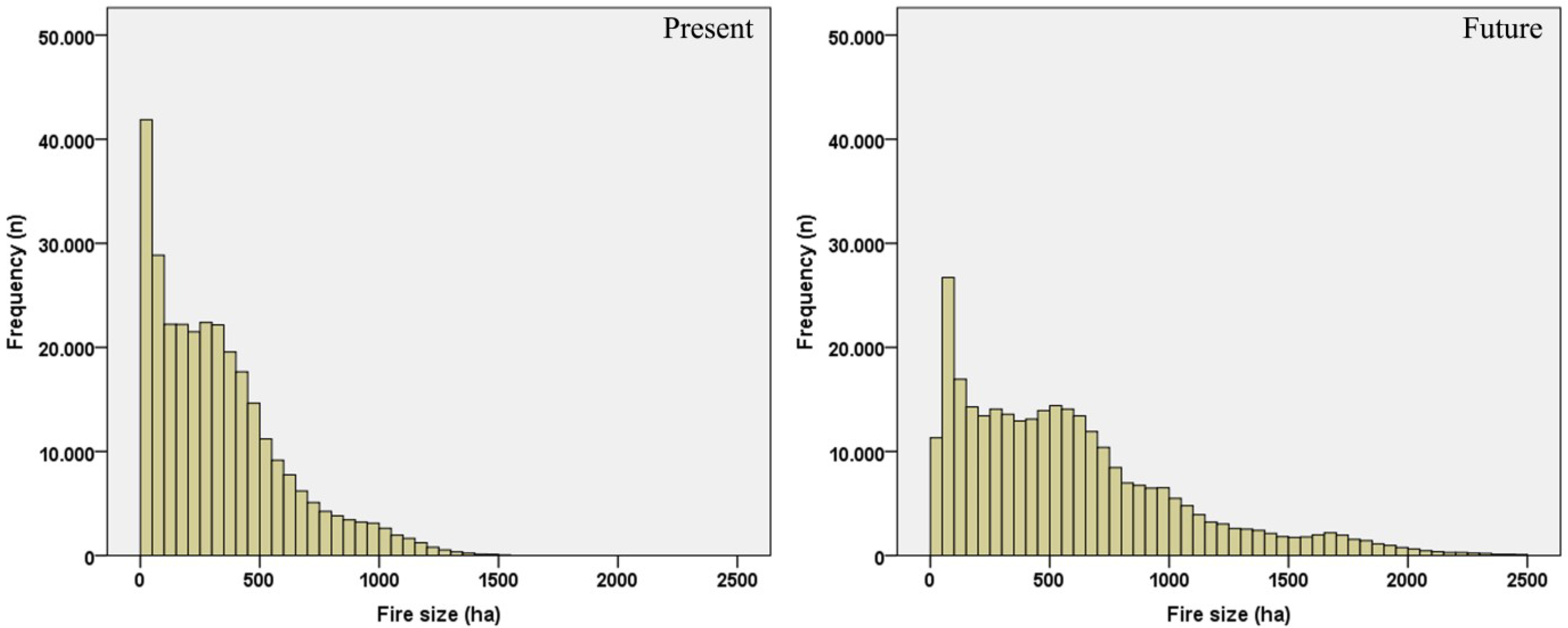 In this study, the weather hypothesis was applied by conducting fire behavior simulations of hard to control large wildfires that burn for five hours, based on data for present and future climate conditions derived from a Regional Climate Model (RCM). Key goals are to assess the degree of expected changes in the size, conditional burn probabilities and intensity of large wildfires that resist initial control efforts and to estimate the anticipated impact on values-at-risk in the area of Messinia in Peloponnese, Greece. Under the same context, the Canadian Forest Fire Weather Index’s (FWI) present and future RCM-derived values [32,33] were analyzed and statistically tested to identify trends and patterns of present and future fire risk.