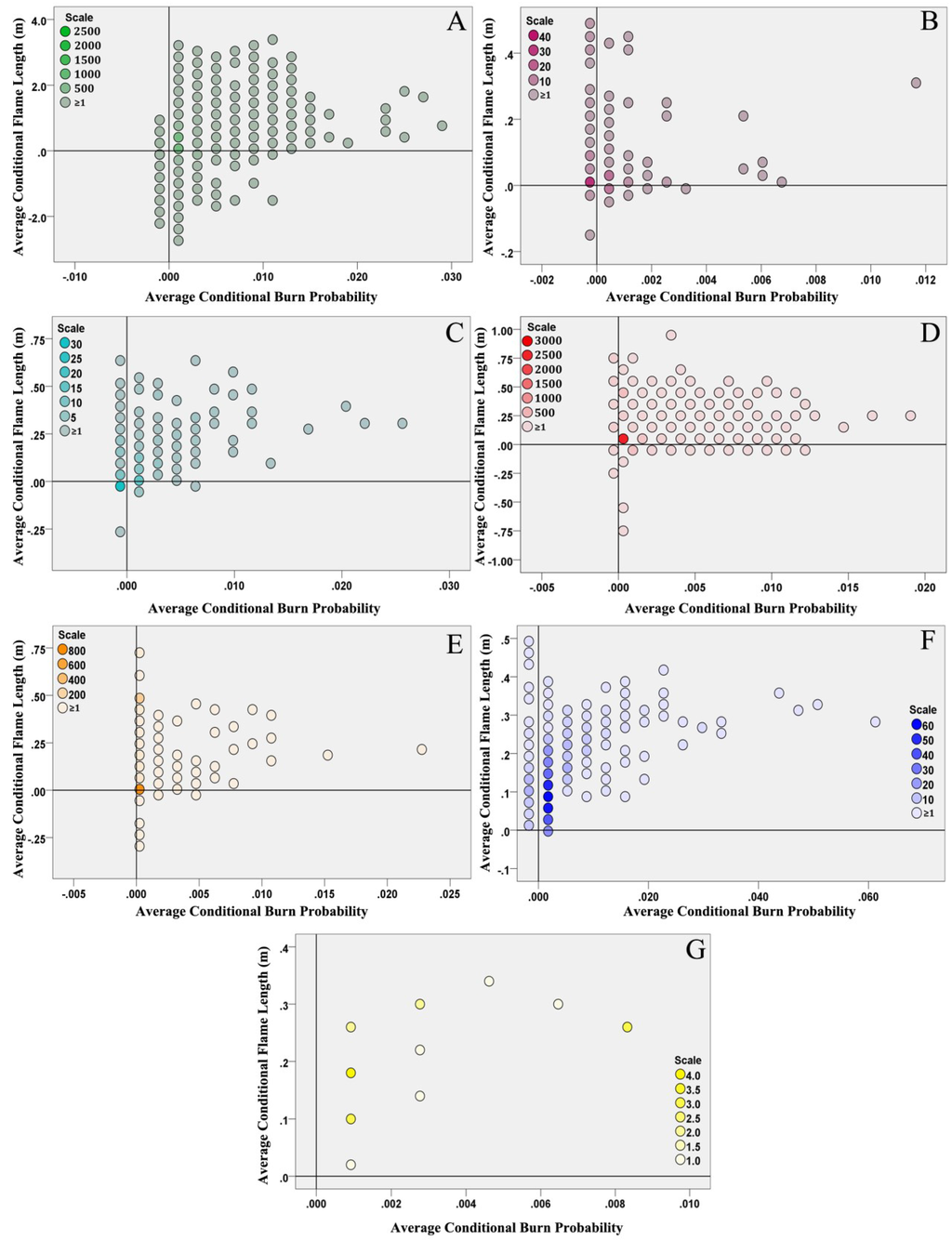 Hex-binned scatterplots of the two time periods CBP and CFL differences (Future minus Present) for: (A) agricultural installations; (B) hotels, (C) monuments, (D) houses, (E) industries/businesses, (F) WUI sites and (G) wildlife habitats (scale refers to the number of cases contained at each colored hex bin).