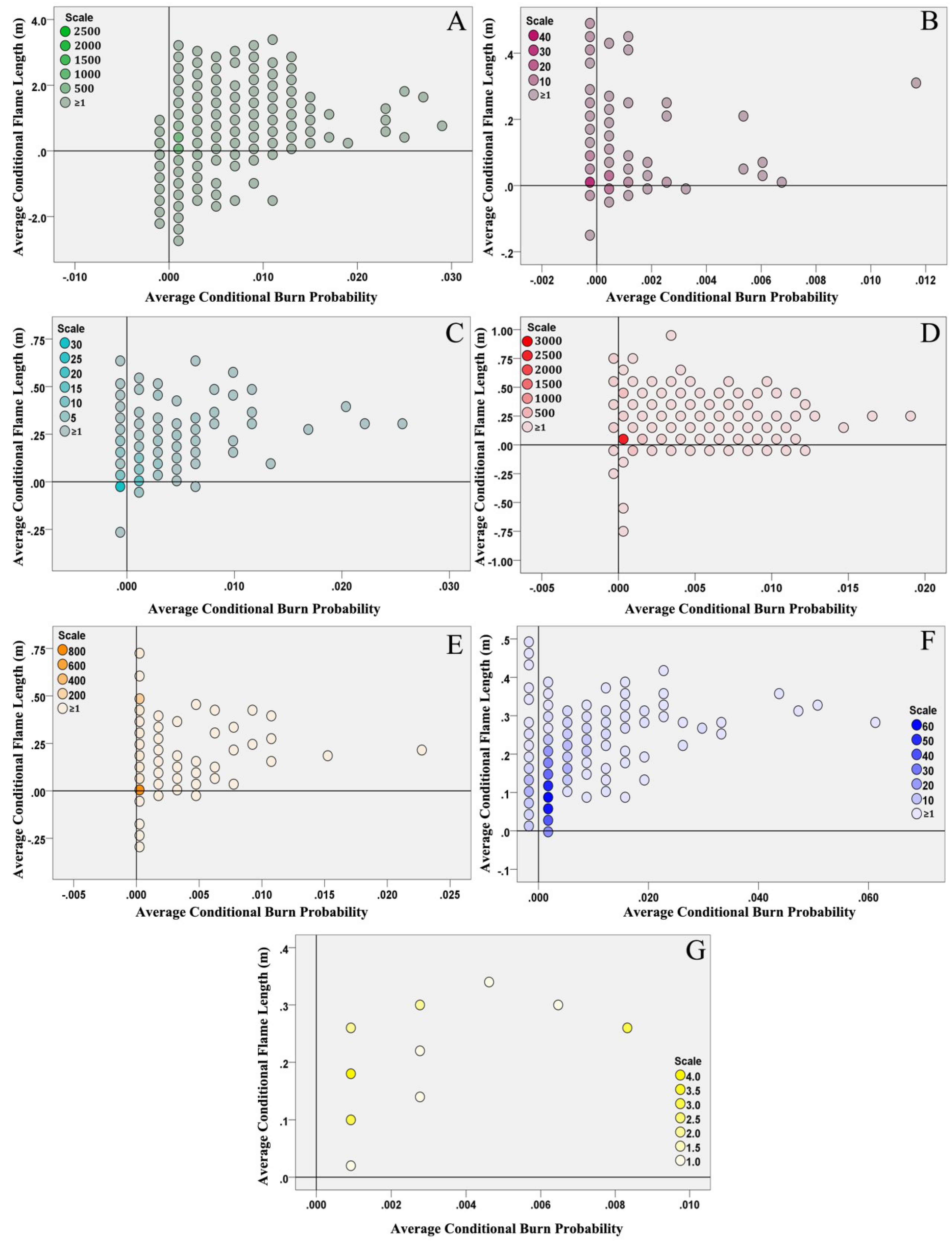 Conditional flame length (CFL) is the probability weighted flame length given a fire occurs and acts as a measure of wildfire hazard [63], while it is calculated by incorporating the flame length distribution generated from multiple fires burning each cell in Equation (3):