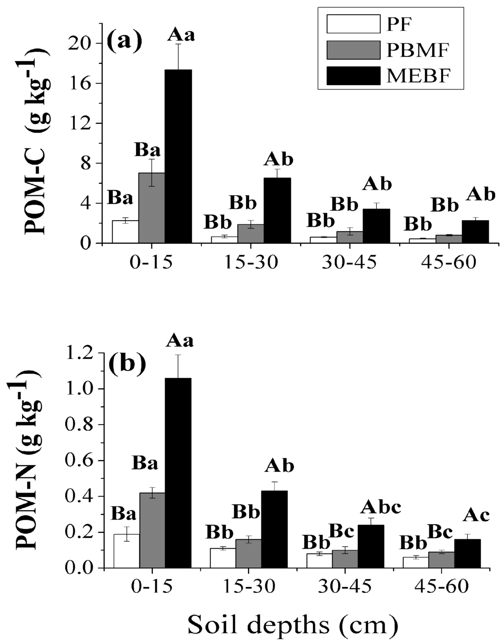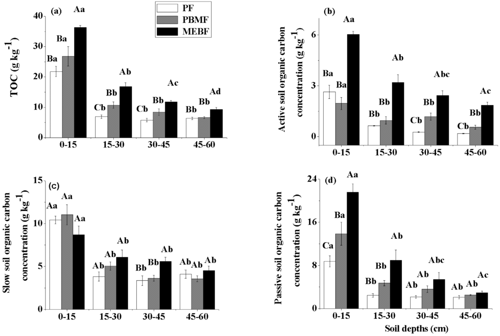 Average concentrations of TOC, active SOC, slow SOC, and passive SOC all decreased with soil depth (Figure 1). In PF and PBMF, TOC, active SOC, slow SOC, and passive SOC concentrations were significantly higher at 0–15 cm compared with the other three soil depths, but there were no significant differences found among the depths of 15–30 cm, 30–45 cm, and 45–60 cm (Figure 1).