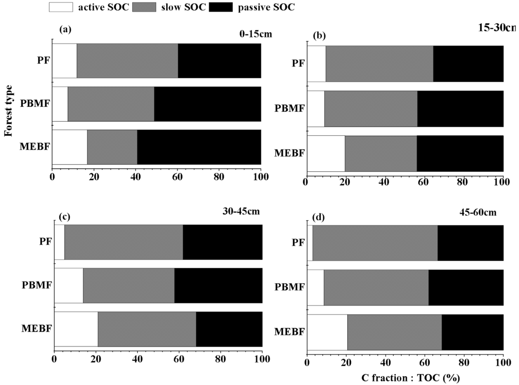 The proportion of active SOC to TOC increased with forest succession (Figure 2). However, the slow SOC proportion decreased with succession, so that MEBF had the least slow SOC proportion. While the passive SOC proportion also increased with forest succession, the significant difference was only found in 0–15 cm.