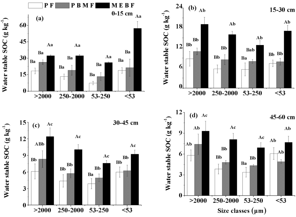 Water-stable aggregate size classes in the 0–15, 15–30, and 30–45 cm soil depths were significantly increased with forest succession in the order PF < PBMF < MEBF (Table 5; Figure 4). In the 45–60 cm soil depth, however, only the small macroaggregate and microaggregate concentrations increased with succession. Along the soil depths, water-stable aggregate SOC concentrations significantly declined with an increase in soil depth (except the size class of 53–250 μm in PF).