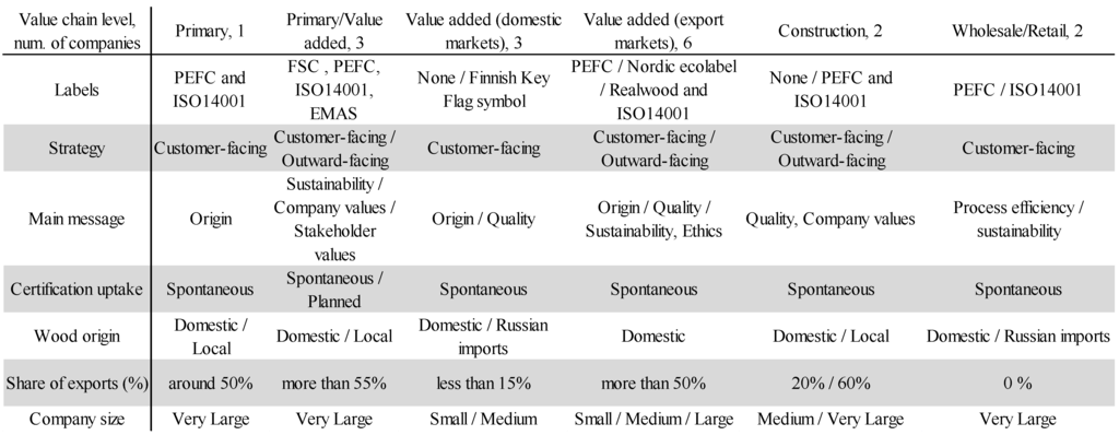 Appendix B) illustrates the use of forest and CoC certification and the environmental management systems, as well as different environmental communication strategies (strategy type, main message, planned/spontaneous uptake of certificates). The analysis is presented among different types of forest industry companies including the value-chain level, wood origin, exports share, and company size.