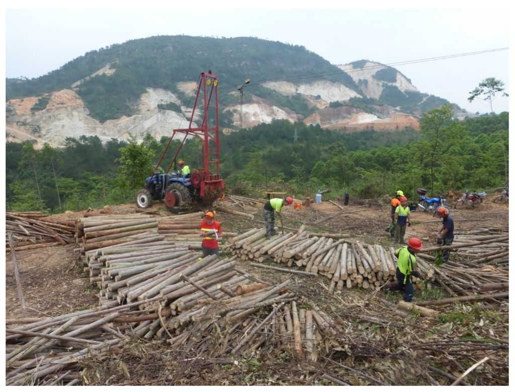 In order to become less dependent on round wood imports, the central government has promoted the development of a forest plantation-based timber industry in selected key regions of Southern China [8,16]. In accordance with the SKFPs, this newly established plantation sector is expected to release utilization pressure from the remaining natural forests in the country’s traditional timber regions of the northeast and eastern China. It further emphasizes a major relocation of the forest products industry to the southern provinces. This major shift of the entire forestry sector resulted in two main types of forest plantation management regimes in the South. The majority of the plantations follow the objective of cultivating fast-growing high-yielding timber species to supply the pulp and wood based panel industries with fiber. The second type focuses on the yield of dimensional timber for a value added sawing industry through long rotations and single tree harvest, including periodic thinnings, consistent with multifunctional forest management and associated ecosystem services, which came up as a new management objective [17]. Although plantation areas have been successfully established in terms of area, yields have been below expectations so far and not competitive with outputs from plantation industries in other countries such as Brazil [16,18]. Reasons for the low productivity are numerous and ranging from silvicultural to operational deficits. Due to the limited land availability in the southern provinces, timber plantations have been mainly allocated to hilly terrain. In conjunction with a poor operation infrastructure and almost non-existent mechanization of log extraction, volume outputs of these plantation operations are rather low [16,19]. Considering increasing wages among the Chinese forestry sector of 5% annually [8] and the enormous timber demand of the Chinese wood products industry, a shift from the currently labor intensive, daily rate-based manual harvesting operations towards professionalized operations with a higher degree of mechanization is inevitable. This even more so since the majority of the workforce in harvesting operations consists of migrant workers from other Chinese provinces and Vietnam, whose availability is dwindling since urban manufacturing industries offer higher paid jobs in a more safe and comfortable working environment. Cable yarding systems seem to be suitable technologies to overcome the challenges in forest operations in southern China and have been tested in the region already as far back as the 1950s [20,21,22]. However, potential performance capacities and related costs of cable yarding harvesting systems, as well as the characteristic technical features required under Chinese operational conditions are hardly known.