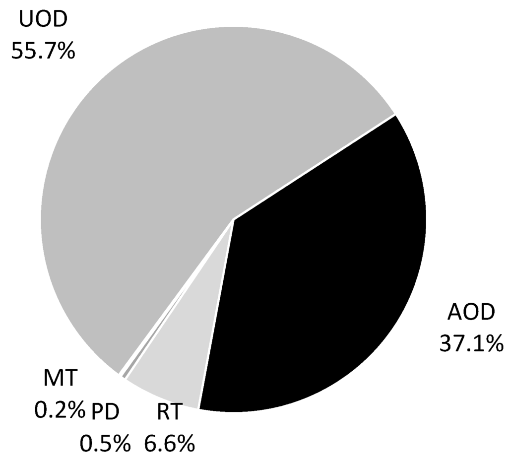 Special attention was given to delay events by grouping them into categories based on the IUFRO guidelines [26]. Main categories have been “Mechanical Delays”, with the subcategories “Repair Times” (RT) and “Maintenance Times” (MT); “Operational Delays”, with the subcategories “Avoidable Operational Delays” (AOD) and “Unavoidable Operational Delays” (UOD); and the final category, “Personal Delays” (PD) (Table 4). Delays resulting from conducting the survey and formal break times were excluded from the records. In addition to the main delay categories and associated subcategories, any single delay event type that occurred was defined, and its occurrence and duration recorded accordingly. Rigging times were recorded separately from the cycle times using stopwatches.