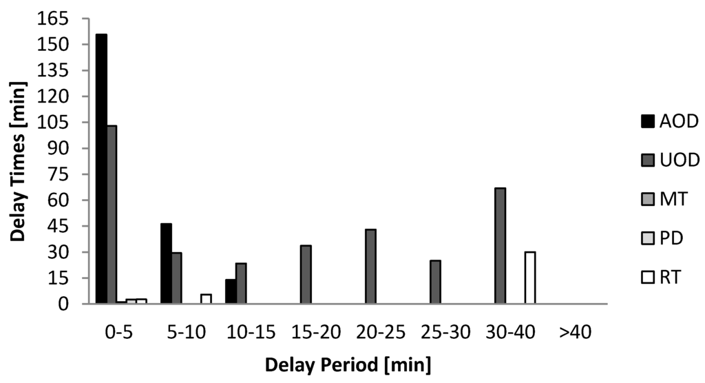 Most frequently occurring individual delay events have been shorter than 5 min, with durations often lasting only a few seconds, accounting for 404 of the recorded 427 delays. However, due to the overall high frequency of these short events, they contribute significantly to the overall sum of delay times (Figure 4). The longest occurring single delay event lasted 35.95 min and was associated with the rigging procedures, which could be averaged for the entire operation to 23.16 min for either installation or dismantling.