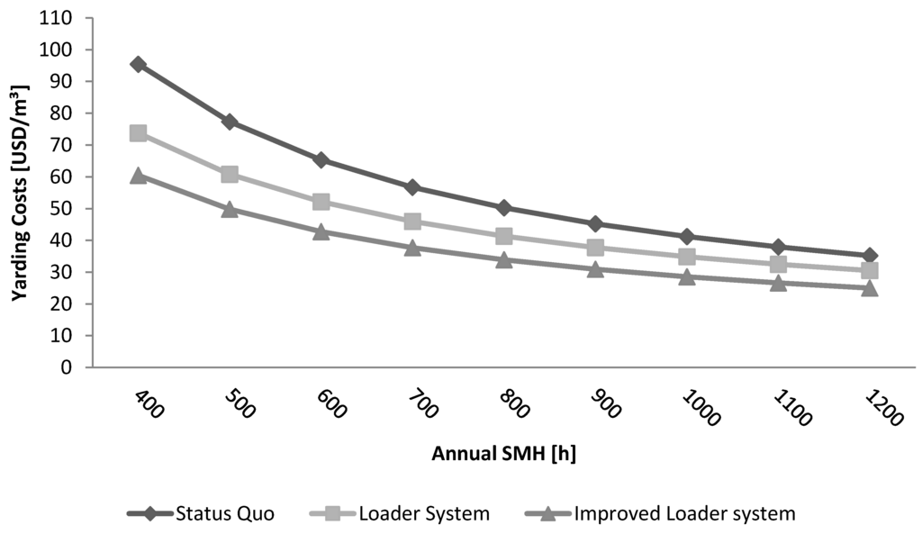Yarding costs (USD/m³) as a function of annual utilization hours (SMH) related to the modeled productivity (m³/h) and a 10 year depreciation period with associated system overhead costs for the three scenarios: “Status Quo” (2.50 m³/h), “Loader System” (2.50 m³/h) and “Improved Loader System” (3.05 m³/h).