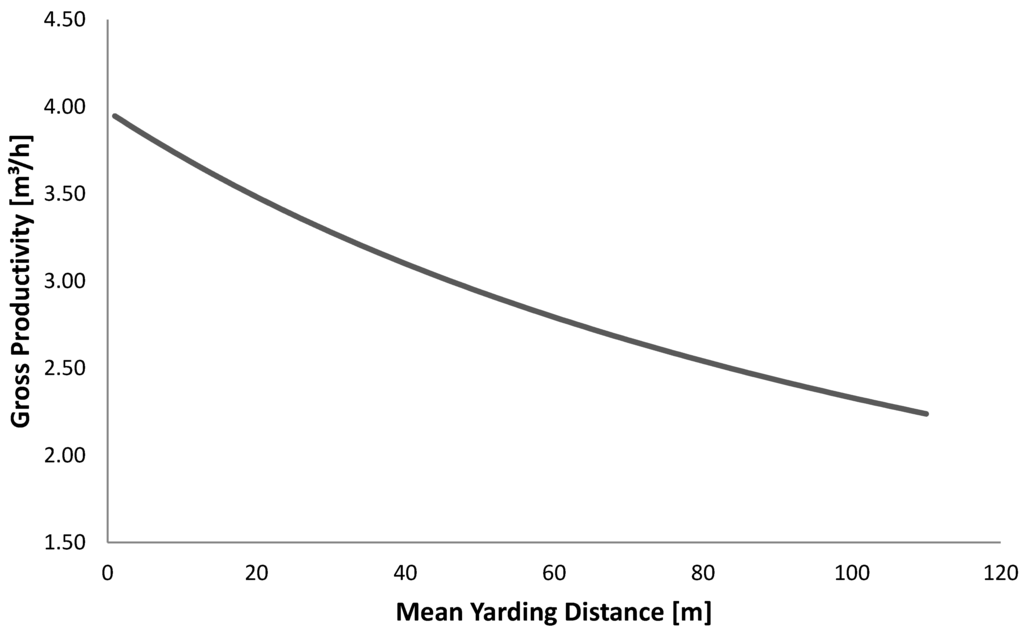 Overall gross productivity, based on SMH, including all delays, lead to mean cycle times of 7.28 min and a productivity rate of 2.50 m³/h. The PMH15 (productive times including delay times up to 15 min) productivity rate, which is commonly used to describe system performances [31], included 66% of all observed delay times and had a corresponding cycle time of 6.02 min and an output of 3.03 m³/h, respectively (Figure 5). The initial cost calculation for the hauler crew with the current set up was determined to be 125.59 USD per hour for 800 SMH operations annually. That resulted in actual yarding costs of 24.82 USD/m³ for PMH0 (5.06 m³/h), 41.45 USD/m³ for PMH15 (3.03 m³/h) and 50.24 USD/m³ for SMH (2.50 m³/h) rating.