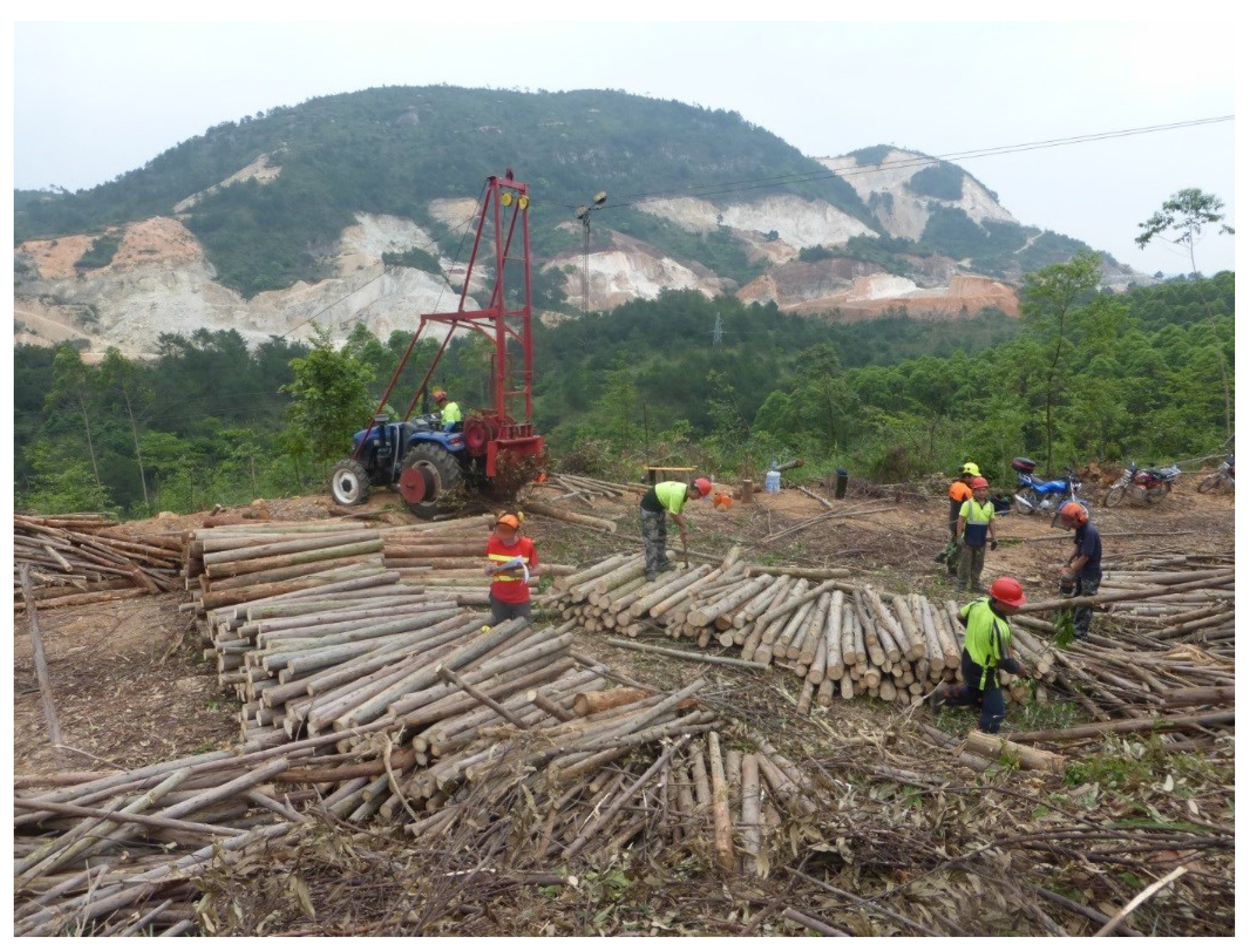 8] and the enormous timber demand of the Chinese wood products industry, a shift from the currently labor intensive, daily rate-based manual harvesting operations towards professionalized operations with a higher degree of mechanization is inevitable. This even more so since the majority of the workforce in harvesting operations consists of migrant workers from other Chinese provinces and Vietnam, whose availability is dwindling since urban manufacturing industries offer higher paid jobs in a more safe and comfortable working environment. Cable yarding systems seem to be suitable technologies to overcome the challenges in forest operations in southern China and have been tested in the region already as far back as the 1950s [
