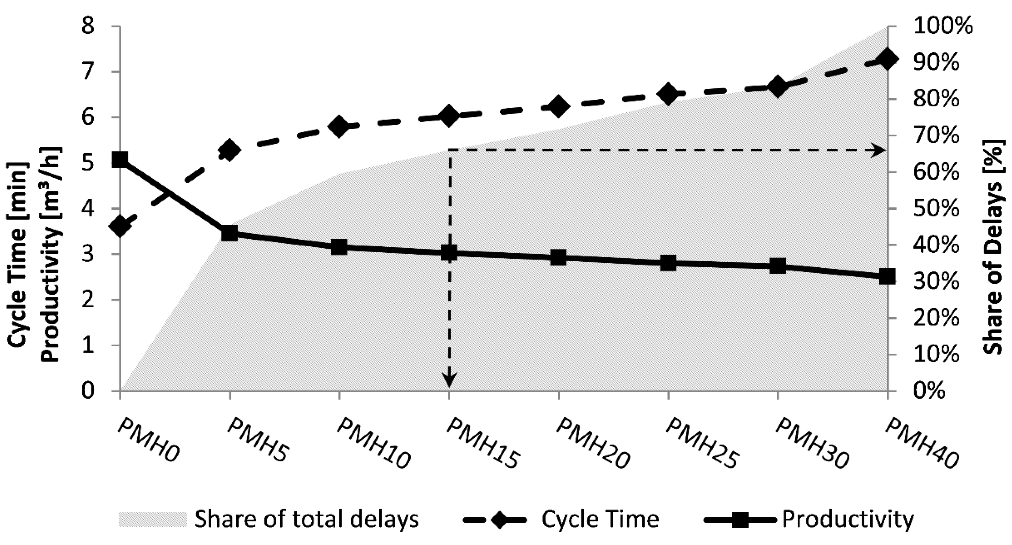 Performance indicators according to added delays, with performance rated through cycle time (min) and productivity (m³/h) on the left y-axis in dependence of different delay time threshold additions on the PMH on the x-axis and the overall coverage of delay times experienced in this study on the right y-axis.