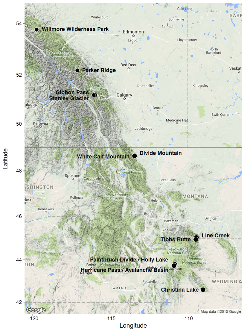| Divide Mountain/White Calf Mountain; Glacier National Park, Blackfeet Indian Reservation, MT | 48°39′25′′ N 113°23′45′′ W; 48°38′20′′ N; 113°24′08′′ W | 1920–2272 | NE, NW, W, SW | 225 m2; N = 30 | 6750 m2; random | Smith-McKenna et al. [48] |