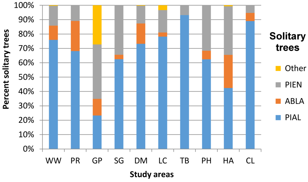 Among study areas, conifer species richness S for solitary trees ranged from 2 to 5 and for tree islands from 3 to 5, with the highest richness in the Line Creek study area (Table 3). With the exception of the Gibbon Pass and Tibbs Butte study areas, solitary trees and tree islands were composed primarily of whitebark pine (PIAL), subalpine fir (Abies lasiocarpa (Hook.) Nutt., ABLA), and Engelmann spruce (Picea engelmannii Parry ex Engelmann, PIEN). Small numbers of other species occurred in several study areas: lodgepole pine (Pinus contorta Douglas ex Loudon, PICO) in Willmore Wilderness Park and Line Creek, alpine larch (Larix lyallii Parl., LALY) in Gibbon Pass, and Douglas-fir (Pseudotsuga menziesii (Mirb.) Franco, PSME) in Divide Mountain and Line Creek (Table 3).