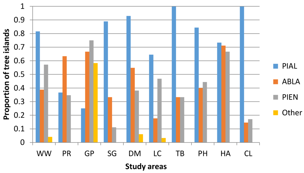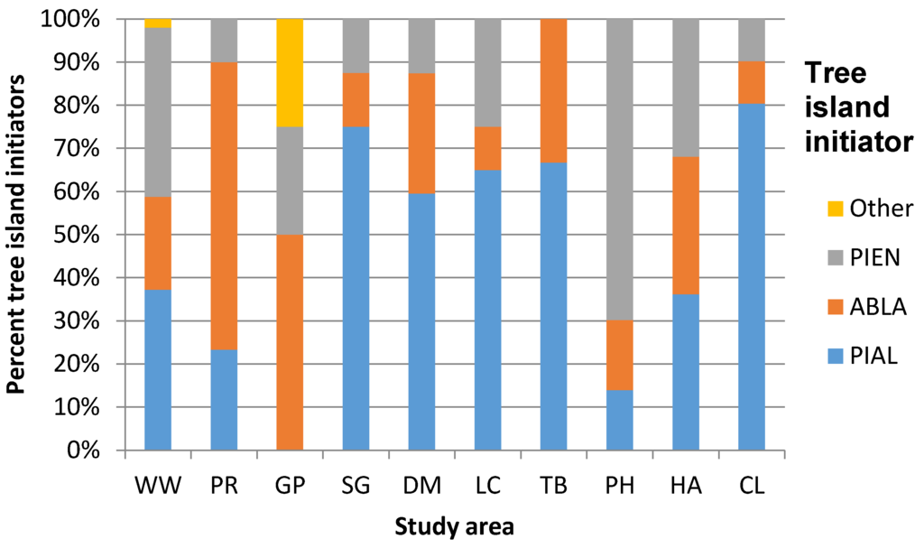 Relative proportional abundance of whitebark pine as a tree island initiator, as inferred by its leading windward position in tree islands, within each study area. See Table 3 for conifer species listed under “Other”, and Figure 3 for conifer species abbreviations and study area abbreviations.