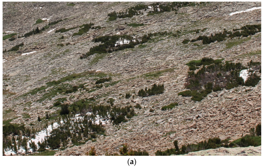 | Hurricane Pass/Avalanche Basin; Grand Teton National Park, WY | 43°43′41′′ N; 110°51′02′′ W | 3045–3204 | NW, SW, NE | 225 m2; N = 20 | 4500 m2; random | Resler and Shao, unpublished data [55] |