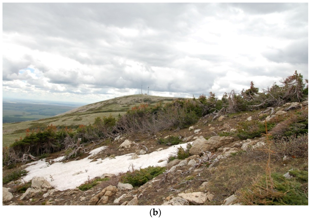 - Resler, L.M; Tomback, D.F.; Malanson, G.P. Treeline community structure and composition on Parker Ridge, Banff National Park. Virginia Tech: Blacksburg, VA, USA, unpublished data; 2015. [Google Scholar]