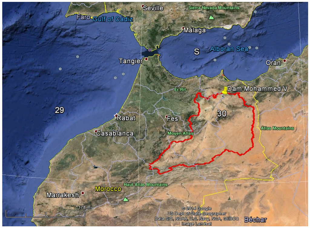Location and delineation of the Moulouya River watershed upstream of the dam Mohammed V (UTM 30N projection and WGS84 reference system).