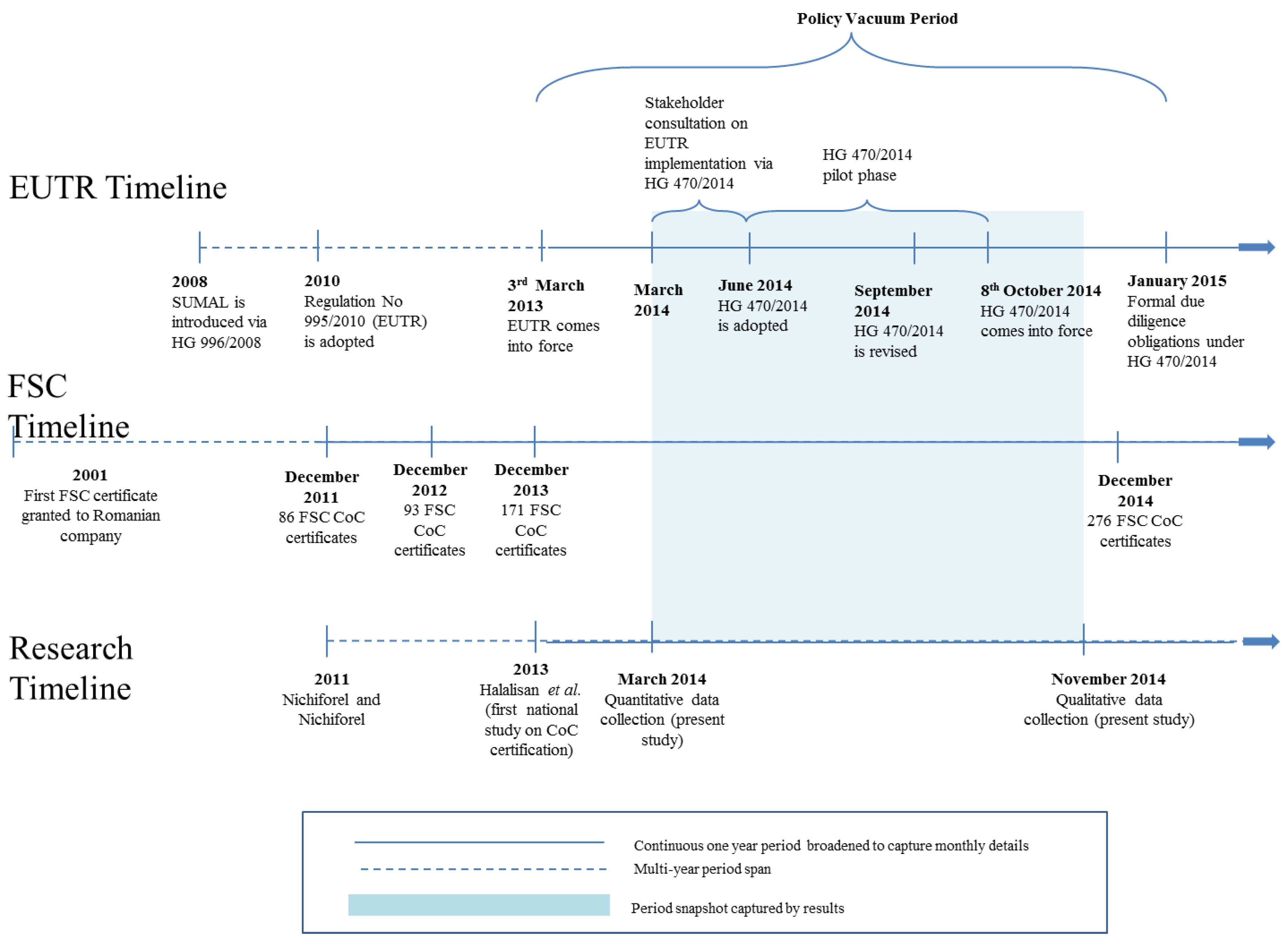 The slow, complex and somewhat ambiguous process of EUTR implementation created a “policy vacuum” in Romanian forest legislation. This policy vacuum period lasted from 3 March 2013, when EUTR came into force, until 8 October 2014, when HG 470/2014 as the implementing law came into force (Figure 2). A policy vacuum typically refers to a situation where there is a lack of public policy (laws or regulations) addressing a certain situation or policy problem, or where existing policies are inadequate to regulate the conduct in a given situation [29,30,31].