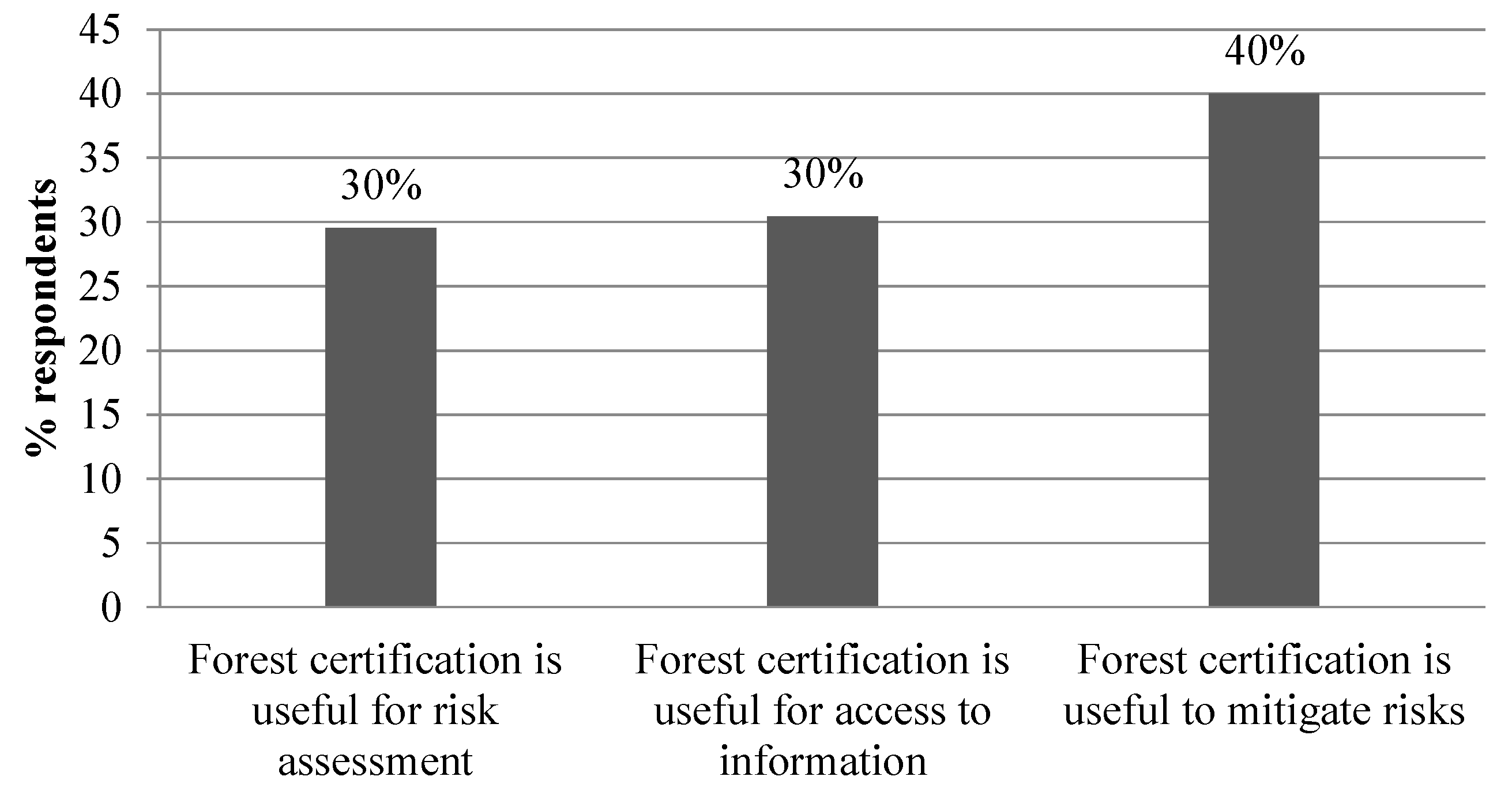 When asked about the role of forest certification in fulfilling EUTR requirements, most certified companies (40%) indicated that FSC certification is useful in reducing the risk of trading illegal timber and timber products. The rest of the respondents (30.4% and 29.6%) almost equally agreed that forest certification is useful for information access and risk assessment of the suppliers (see Figure 3). WWF Romania also believes that operators could fulfill their due diligence obligations through forest certification. This indicates that well established and transparent supply chain procedures and administration implemented through certification prompted respondents to consider that the certification process can help them to prepare for and align with EUTR requirements.