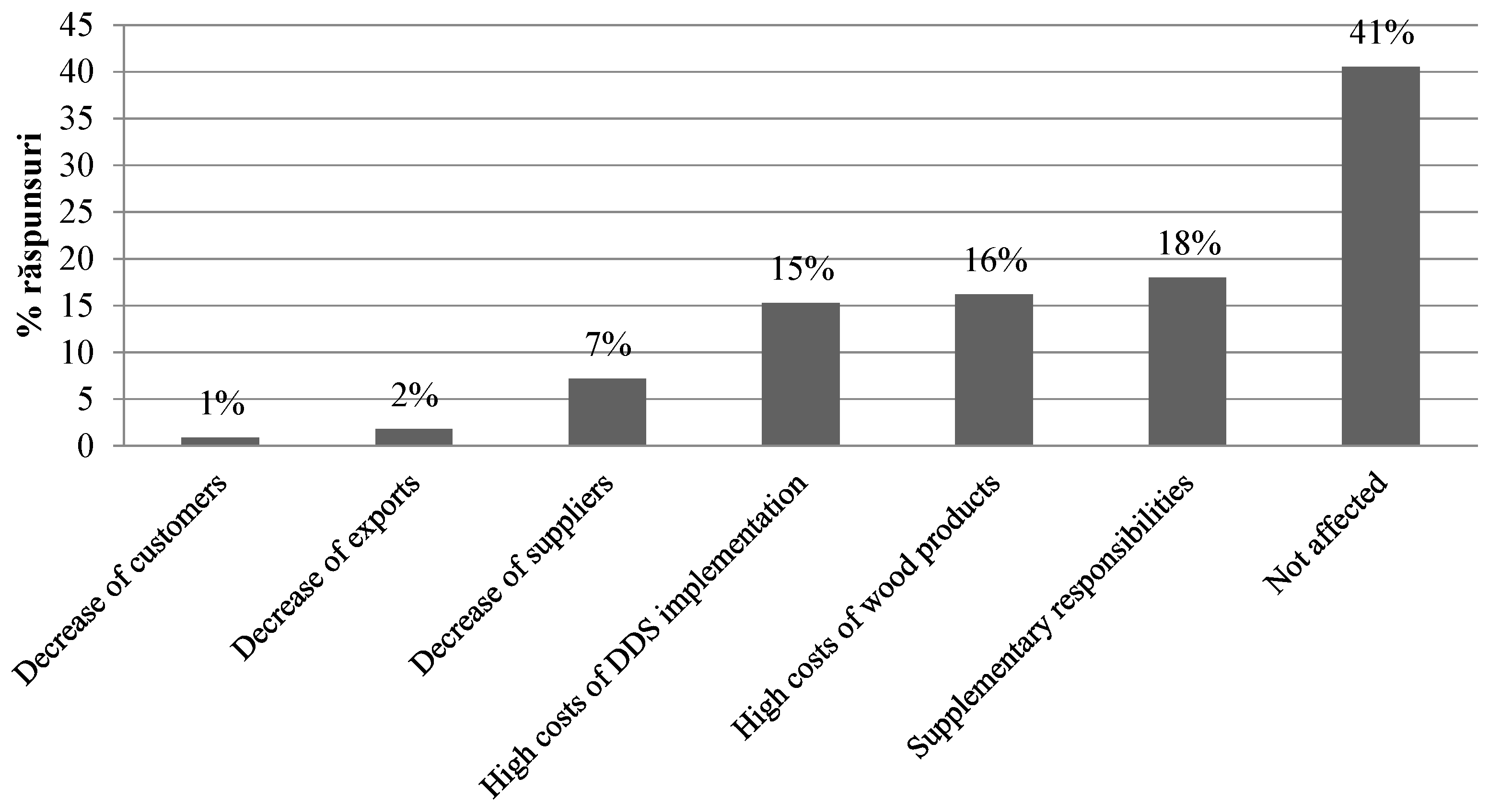 Nevertheless, some respondents (18%) indicated that the EUTR may represent an additional burden or contribute to raising costs for purchased timber products. Fewer respondents (15%) indicated that the EUTR will result in higher costs for implementing DDS (see Figure 4). The forest industry association in Romania (ASFOR) expressed concerns that new requirements introduced through the EUTR and HG 470/2014 would not only introduce supplementary responsibilities but also the need to hire more people, and thus they would raise additional costs for Romanian companies. ASFOR representatives feared that such cost increases might affect their competitiveness on the EU timber market. In contrast, only a few respondents from FSC certified companies indicated that the EUTR may decrease supply, consumer demand or exports (see Figure 4).