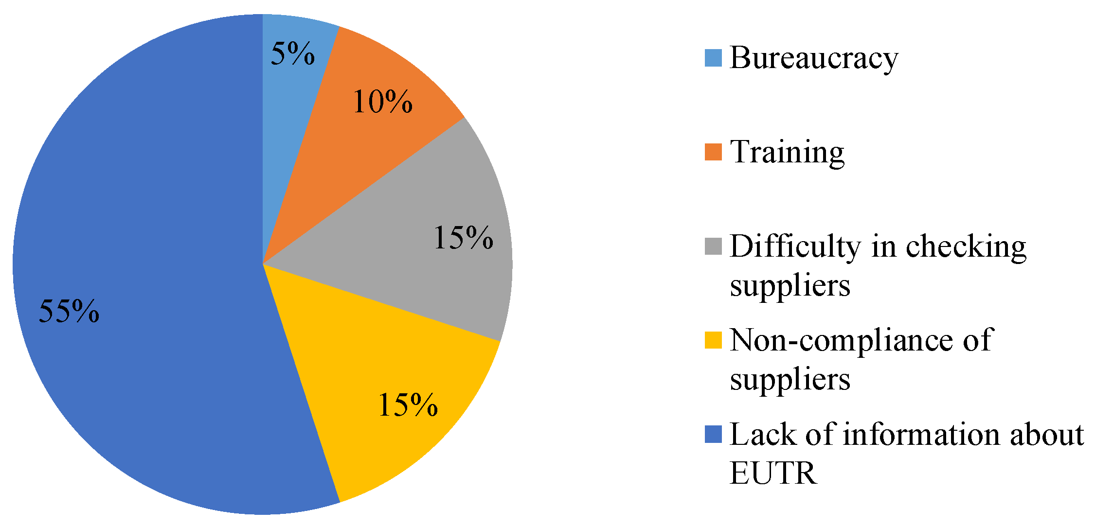 More than half of the interviewed companies (55%) indicated that the main problem related to implementing the Regulation was the lack of information and guidance on the specific requirements (see Figure 5). Not much has changed in this regard, since lack of information on the EUTR had been identified by Nichiforel and Nichiforel [6] as a main problem that was expected to hinder EUTR implementation and compliance in Romania, already three years before the present study. By the time this other study was conducted, the EUTR was still not fully implemented. HG 470/2014 was just embarking on a stakeholder consultation process. This marked the beginning of the policy vacuum period that slowed down EUTR implementation at the national level.