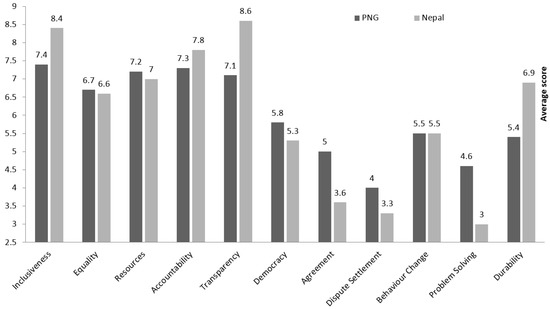 The four most significant governance values at the indicator level for both countries were inclusiveness, resources, accountability, and transparency, but in different orders of priority. In Nepal, stakeholders ranked them in the order of transparency (8.6 out of 10), inclusiveness (8.4), accountability (7.8), and resources (7) (TIAR), and in PNG, inclusiveness (7.4), accountability (7.3), resources (7.2) and transparency (7.1) (IART). The lowest prioritised indicators were also the same for both countries—agreement, dispute settlement, and problem solving, but again in different orders; in Nepal, problem solving (3), dispute settlement (3.3), and agreement (3.6), while in PNG they were dispute settlement (3.3), problem solving (4.6), and agreement (5).