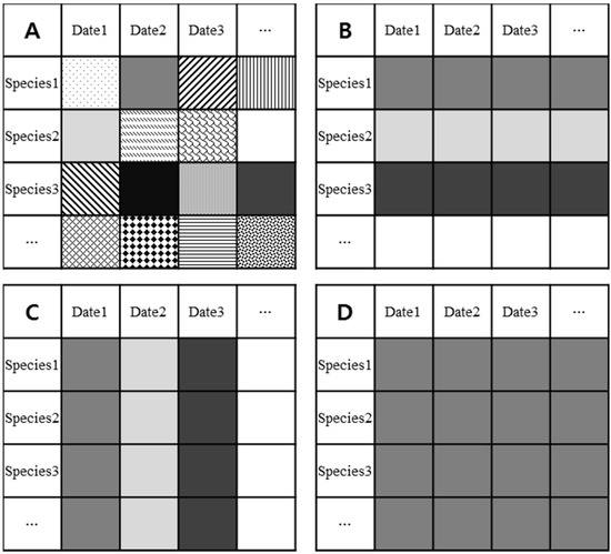 Diagram of the specific leaf area (SLA) calculation methods (A: species- and collection date-specific SLA; B: species mean SLA with no consideration of seasonal variation; C: date-specific mean SLA neglecting species variation; and D: coarse, ignoring temporal and interspecific variation).