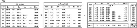 LAI was calculated by dividing the product of SLA (cm2·g−1) and dry weight (g) of leaves by the trap area (cm2). Four different LAI values were obtained using different representative SLA values (Figure 1):