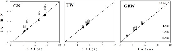 To avoid the effort of calculating SLA for each species in spatially and temporally large scale studies, we tried LAI estimation by obtaining only the SLA of upper canopy species and multiplying it by the total dry weight. In GN, the average SLA of Q. serrata and C. laxiflora was 197.33 cm2·g−1, generating LAI of 6.36 m2·m−2; in TH, the average SLA of Q. serrata, Q. aliena, and P. sargentii was 159.6 cm2·g−1, generating LAI of 5.417 m2·m−2; and in GRW, the average SLA of F. rhynchophylla, K. septemlobus, and S. alnifolia was 175.13 cm2·g−1, generating LAI of 4.11 m2·m−2. Differences between these LAIs and method A were (GN) 4.2%, (TH) 0.1%, and (GRW) 5.3%, which are similar to method B errors, suggesting that significant error reduction can be achieved by only considering SLAs of upper canopy species.