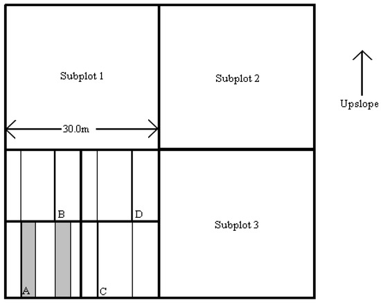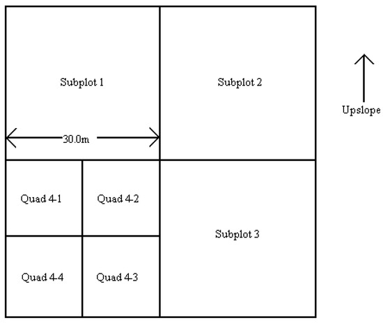 The subplots were numbered sequentially in a clockwise direction, with the subplot number 1 located in the upper left corner of the macroplot. In this fashion, subplot 1 and subplot 2 were always upslope, whereas subplot 3 and subplot 4 were always downslope. Two of these subplots were randomly selected for further sampling.