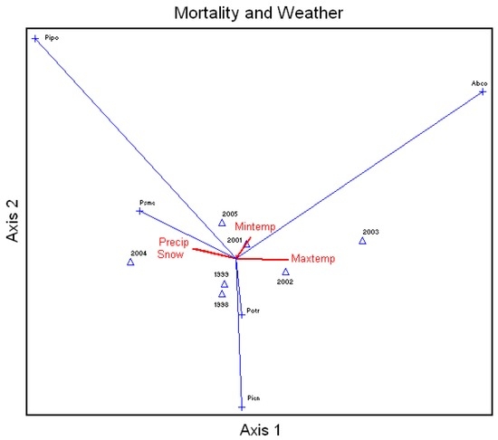 Canonical Correspondence Analysis Ordination on average percent mortality of all species measured in the study area by year and correlated to the calendar year snow (Snow) and rainfall (Precip) and average daily maximum (Maxtemp) and minimum (Mintemp) temperatures. Xxxx = year, Abco = Abies concolor, Pipo = Pinus ponderosa, Potr = Populus tremuloides, Psme = Pseudotsuga menziesii, Pien = Picea engelmannii.