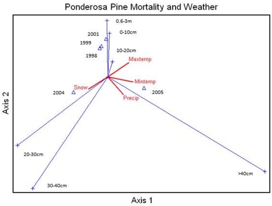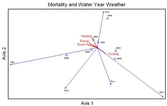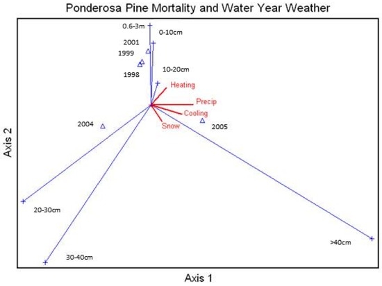 Average percent mortality of unthinned ponderosa pine size classes was correlated with the annual water year snow, rainfall, and number of heating and cooling degree-days (Figure 7), with the largest size class heavily affected by snow, rainfall, and the number of cooling days. This ordination also showed a relationship between snowfall and the larger size classes.