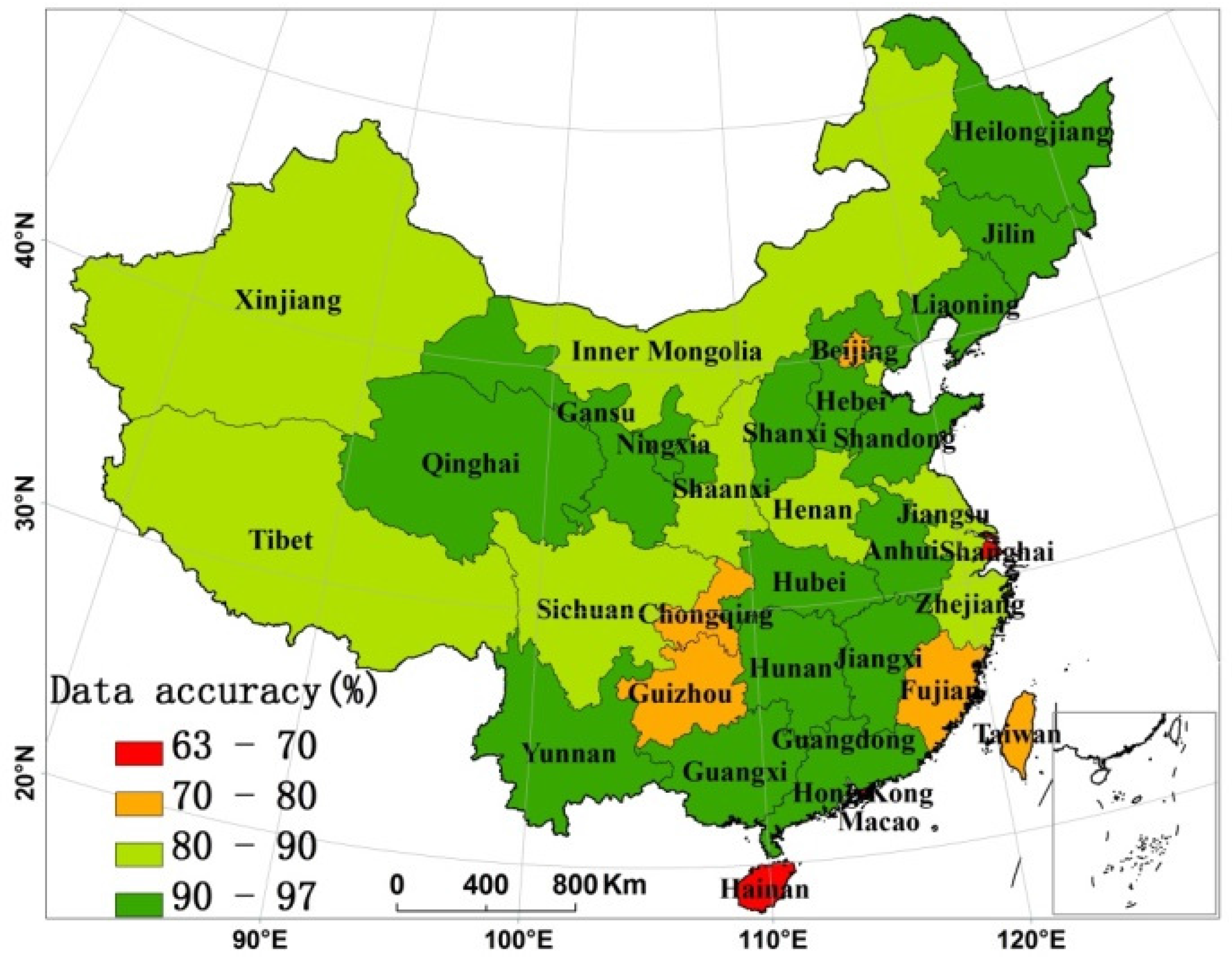 As for the dataset for 2000, we conducted accuracy verification with the aid of high resolution Google Earth images, which are a combination of satellite images and aerial data. For this verification, 1798 random forest sample points were selected across China. The results showed that the interpretation accuracy of forested land in China is 86.21%. From the perspective of the province (Figure 1), the interpretation accuracy of Gansu, Qinghai, and Shanxi are the highest, reaching 96.43%, 95.00%, and 93.85%, respectively. The interpretation accuracy of Shanghai, Hainan, and Chongqing are the lowest at 63.16%, 63.93%, and 74.14%, respectively. The main reason for the lower accuracy is farmland and bare land that is wrongly classified into being labelled as forested land.