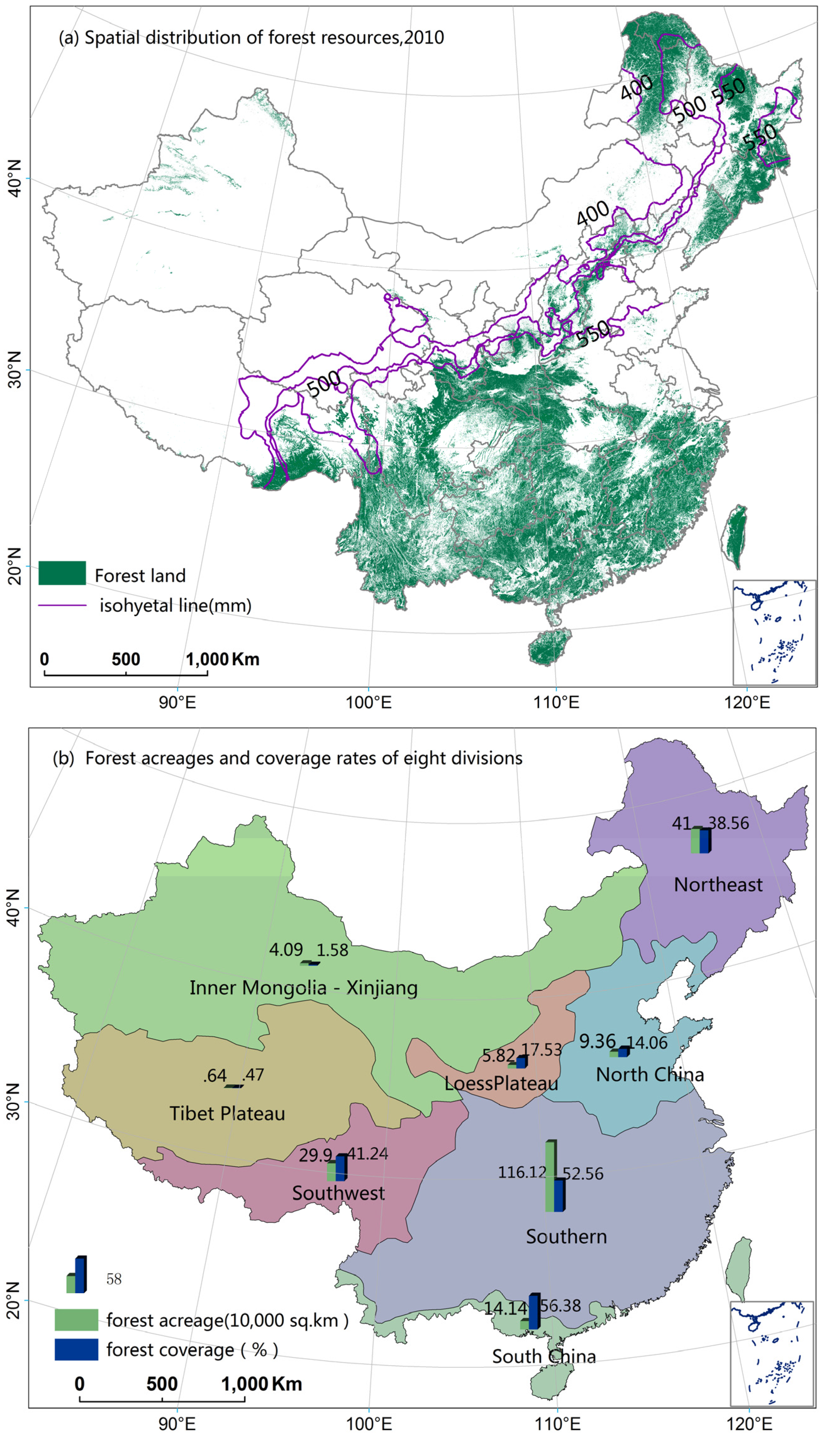 This study shows that the forest resources in China have increased at a faster rate in the 21st century compared to the rest of the world. Indeed, the forested area of China increased from 2,017,600 to 2,120,100 km2 between 2000 and 2010, an increase of 102,500 km2. Across the country, the forest growth rate was 5.08%, and forest coverage rate increased from 20.94% to 22.01%, a 1.06% overall increase between 2000 and 2010. Regionally, the increases in the total acreage of forest area in the zones controlled by the Southern Forestry Division and the Southwest Forestry Division accounted for 81.92% of the total national increase; only the South China Forestry Division experienced a decrease in forest area over this period. Overall, forest areas increased markedly in some western provinces, including Sichuan, Tibet, and Gansu, while a slight downward trend was observed in some eastern regions, including Zhejiang and Liaoning provinces. Across the whole country, Hainan province experienced the most extensive deforestation.