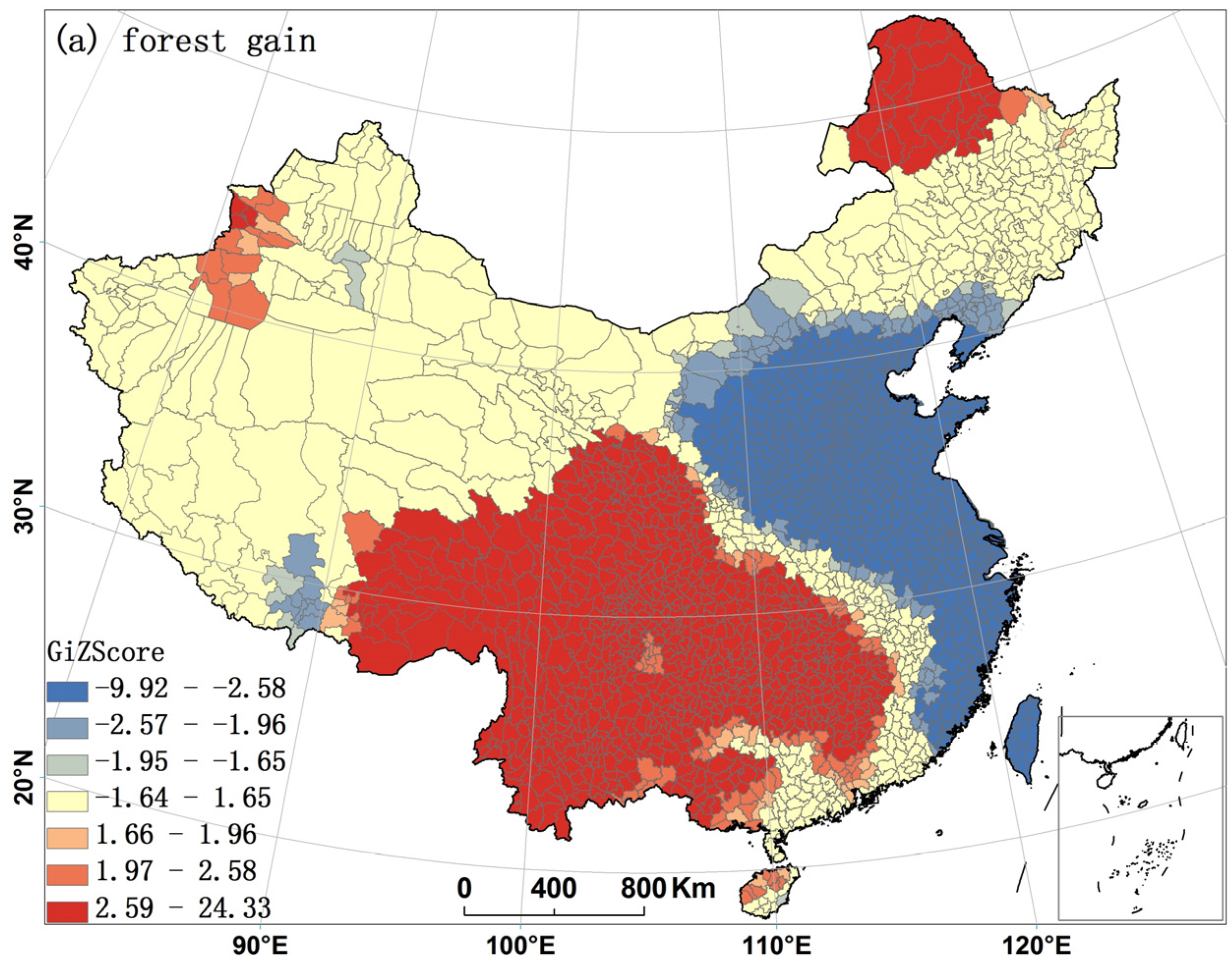 A cold/hot-spot analysis, a method for exploring the distribution of local-scope spatial clustering, was used to determine the high (hot spot)/low (cold spot) value region of spatial agglomeration. A hot (cold) spot is a high (low) value cluster region with significant statistical significance. For instance, the hot spots of forest gain are the regions where the increase in forest area is much larger than expected and have significant statistical significance. That means that a region with numerous increases in forest area would be considered to be one of the hot spots. We used this method to reflect the spatial clustering distribution of forest area change here. The Getis-Ord index is often used to describe cold/hot spots, and if this index was a positive number with a significant statistical significance, the higher the value is the more concentrated the distribution of high value (hot spot) clustering is. The Getis-Ord index was calculated in ArcGIS10.0, and it is defined as
