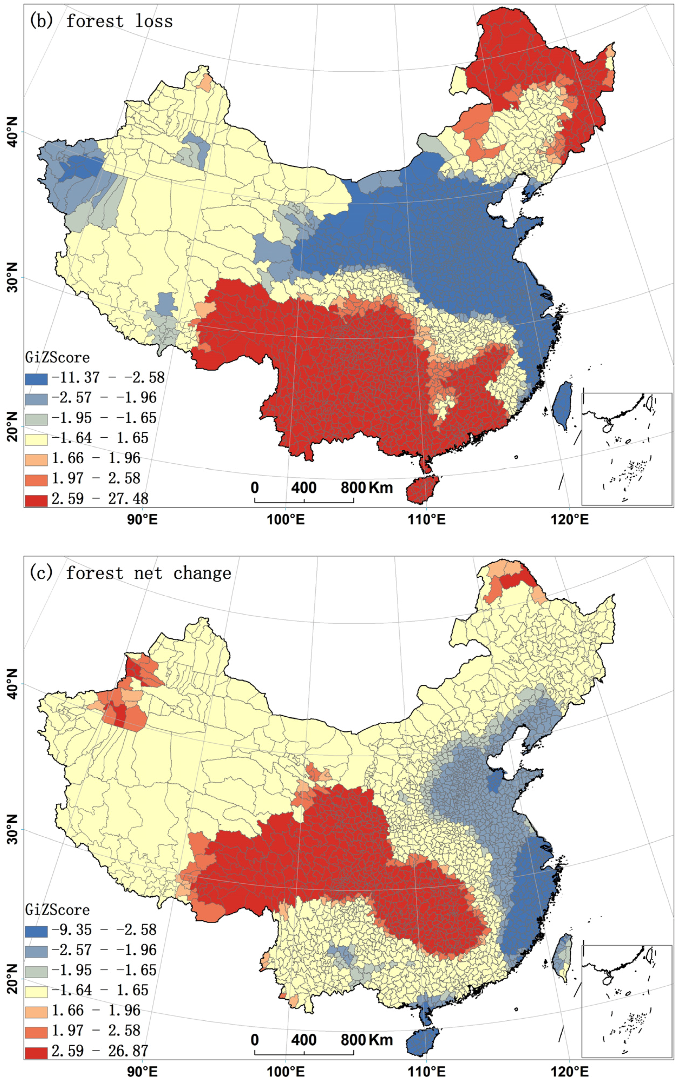 Hot and cold spots of forest area changes in China, 2000–2010: (a) forest gain; (b) forest loss; (c) forest net change. (Notes: Red regions represent hot spots and blue regions represent cold spots.)