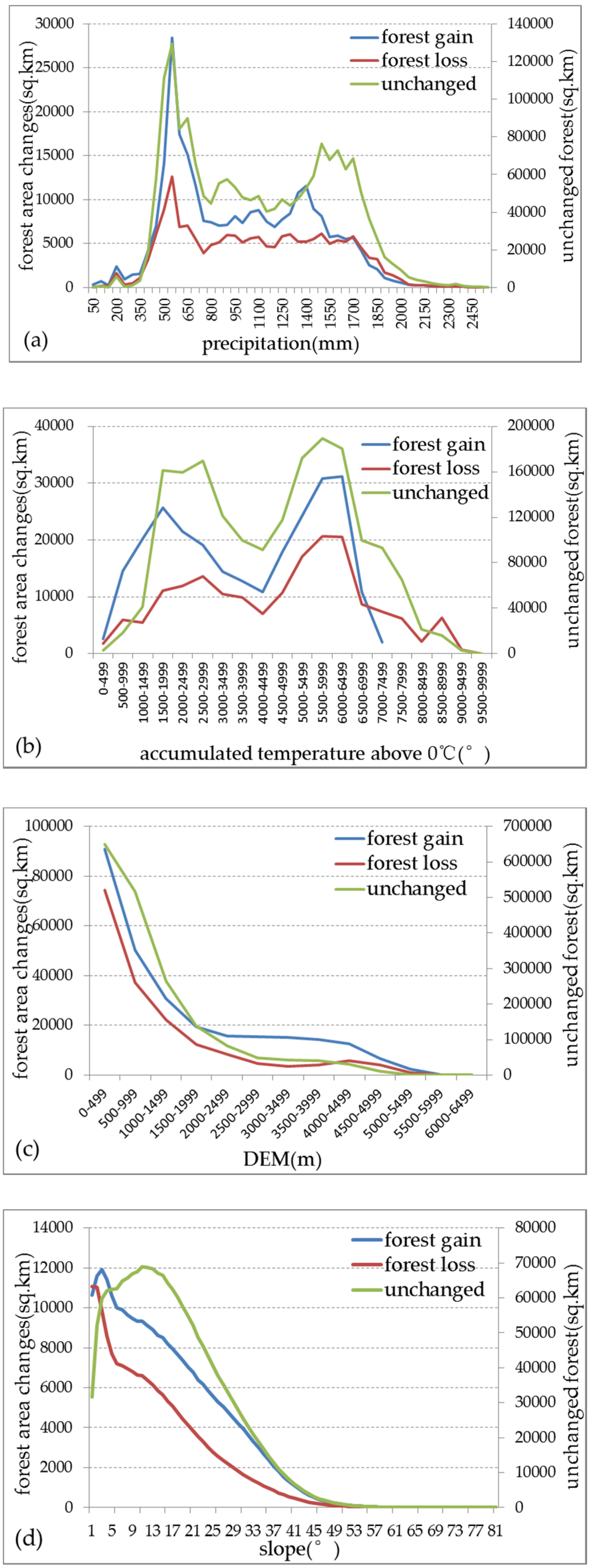 Considering the distribution of forest resources in terms of different regional rainfall patterns (Figure 5a), it is clear that the resource distribution is irregular. Data show a bimodal curve that takes the form of two peaks at 550 mm and 1500–1700 mm, which are mainly caused by a combination of natural conditions and extensive human land use. The distribution of forest gain and loss regions coincide with the original forest distribution according to this partition in precipitation. Indeed, most forested regions are located in areas with 550 mm of precipitation; these are also the most concentrated regions where the forest is either increasing or decreasing. Spatially, precipitation of 550 mm also marks a boundary in forest distribution in the southwest mountains of China (Figure 3a). Similar to the distribution characteristics of forest resources in different rainfall areas, these resources also show an obvious bimodal curve in different accumulated temperature regions; the intervals between the two peaks are 1500–3000 °C and 5000–6500 °C. It is clear that the distribution of forest gain and loss regions are coincide with the original forest distribution according to this partition in accumulated temperature (Figure 5b).