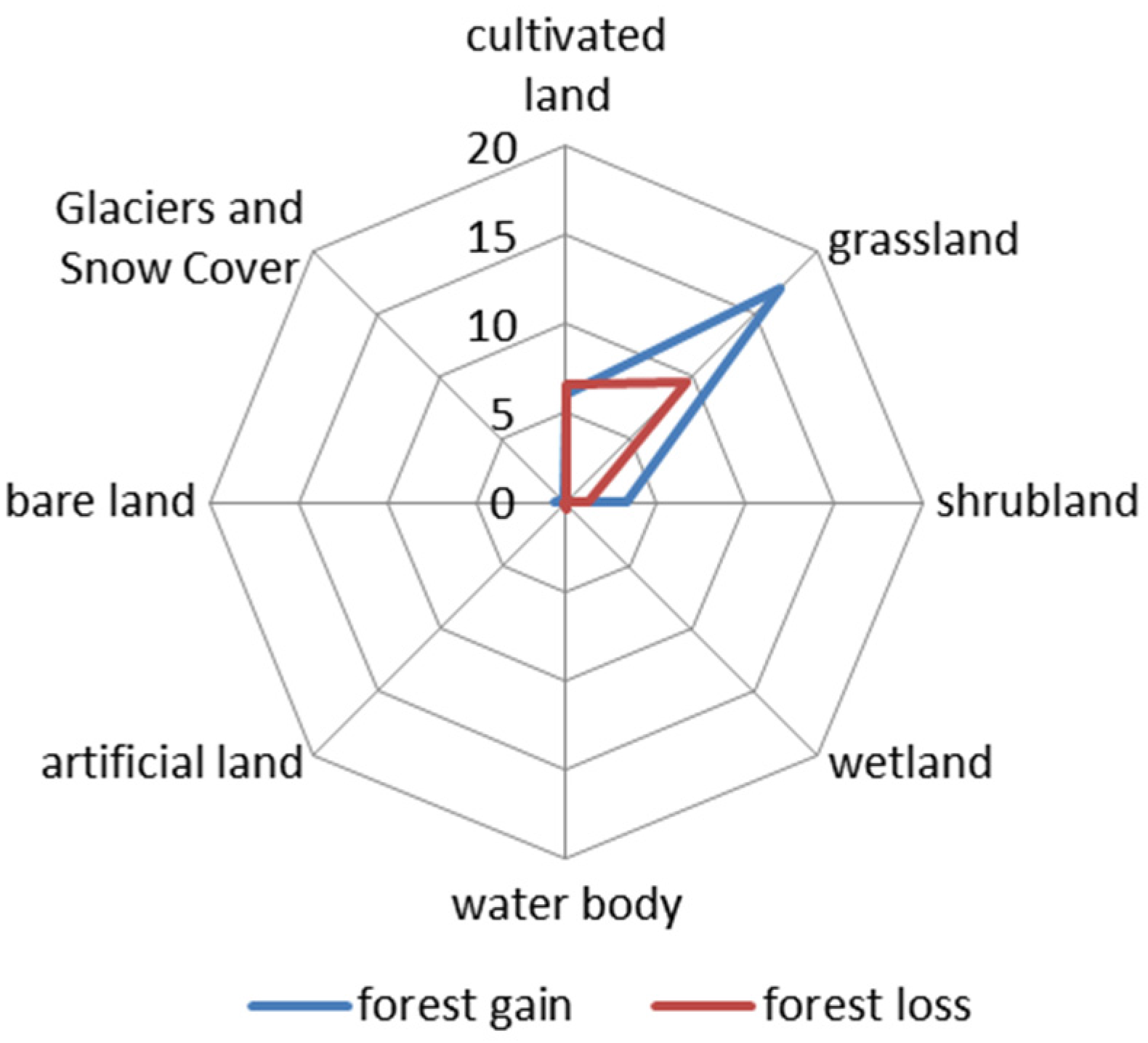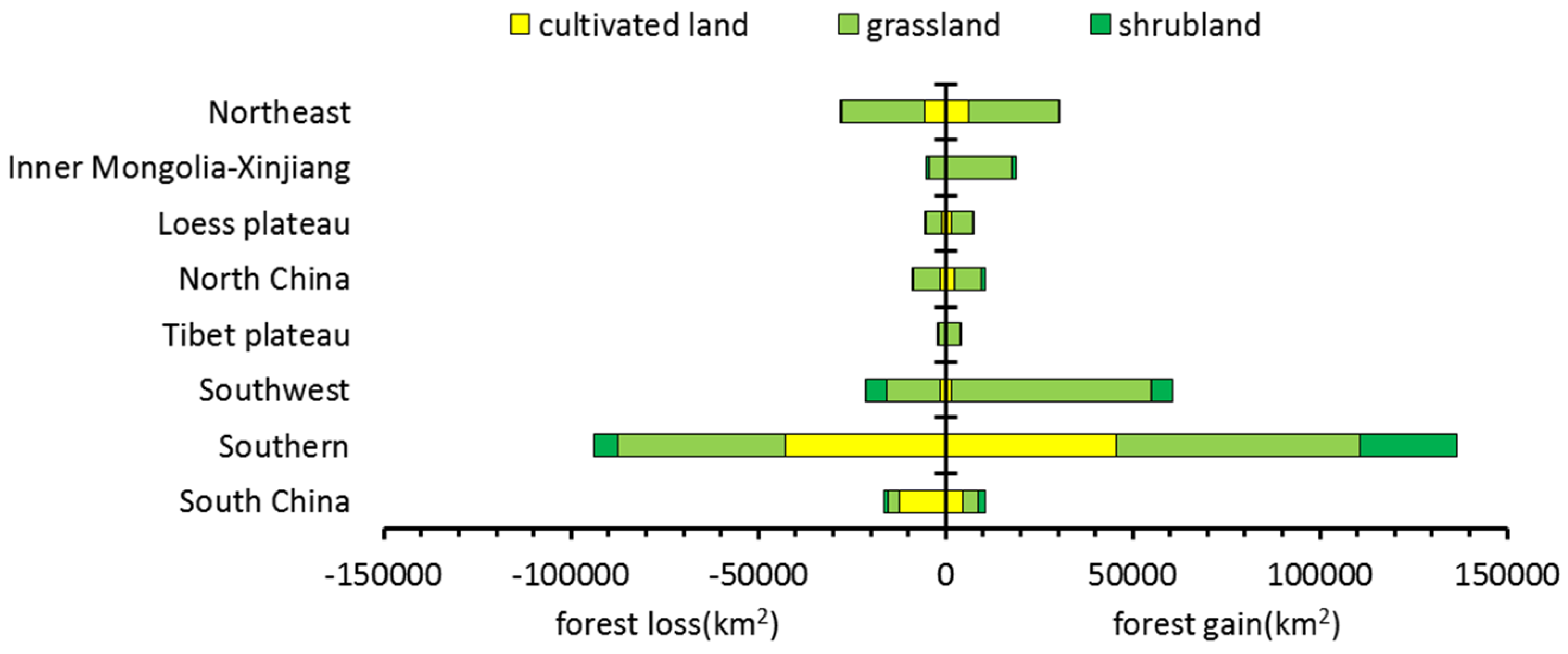 Grassland is the primary source of land being both converted to forest and being converted from forest in China in the early 21st century. Cultivated land and shrubland are in second and third place, respectively, as sources of land that are converted to forest (Figure 6). Between 2000 and 2010, 169,200 km2 of grassland were converted to forest in China, accounting for 61.55% of the increase. In the same period, 60,100 km2 of cultivated land, and 33,400 km2 of shrubland were also transferred to forest, accounting for 21.86% and 12.15% of the total increase, respectively. The total areas of grassland, cultivated land, and shrubland converted to forest account for 95.56% of the total increase, while at the same time, grassland, cultivated land, and shrubland are also the main beneficiaries of forest decrease. These land use types increased by 95,800, 66,200, and 12,900 km2, respectively, as a result of forest decrease, accounting for 52.44%, 36.23%, and 7.06% of the total, respectively, and adding up to 95.73% of the total decrease in forested land in China. As a result of these data, it is clear that there has been a very extensive transfer between forest and grassland in China, which is the key factor balancing forest area change. Indeed, the quantity of transfer between forest and cultivated land has enabled the maintenance of a basic balance. Nevertheless, it is important to note that 66,200 km2 of forest has been transferred to cultivated land as a result of a push to implement the Forest Conservation Policy. Thus, because of developments including the return of farmland to forest, this phenomenon deserves a deeper analysis. Indeed, when this is viewed from the perspective of the regional forestry divisions (Figure 6), land use change in regions overseen by the Southern Forestry Division is the most acute, with the Southwest and Northeast Forestry Divisions in second and third place, respectively. In terms of transformational characteristics, eight forestry divisions exhibit the same variable trend that was observed on a nationwide scale; the main sources and directions of forest increase and decrease are grassland, cultivated land, and shrubland. Finally, it is worth noting that 42,810 km2 of forest have been transferred to cultivated land in the regions overseen by the Southern Forestry Division, and a similar situation is also observed in the regions controlled by the South China and Northeast Forestry Division (12,420 km2 and 5710 km2, respectively). Therefore, one concern going forward should be to focus these three forestry divisions on the issues related to converting forests into cultivated land.