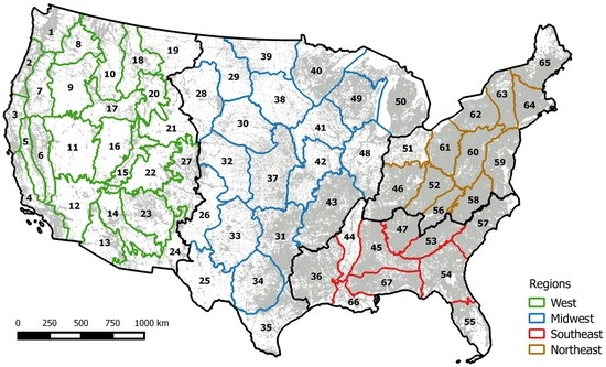 Distribution of wildland–urban interface (WUI) lands including 2.5 km buffer (gray) among regions and ecoregions of the CONUS. See Figure S1 for corresponding ecoregion names.