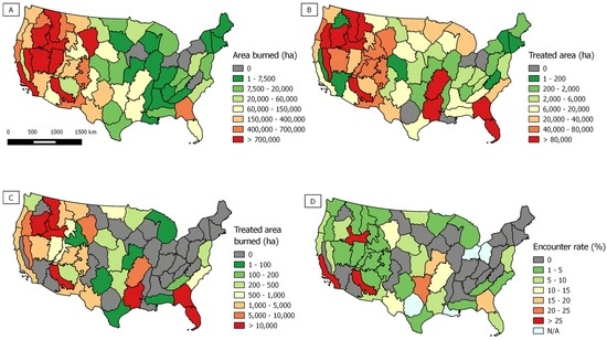 Even though we used the best spatial datasets available to quantify encounters between treatments and subsequent fires, these estimates cannot be used to formally evaluate the success of fuels management at the programmatic level without additional context. Comparing these encounter rates with what might occur under random chance may highlight where in the CONUS they are lower or higher than their expected value. Such an analysis could address whether or not treatments are being strategically placed across large landscapes. Geospatial decision support tools can prioritize treatment locations to establish large, contiguous tracts of land where managed fire can occur without loss of important ecological functions, such as those provided by old growth stands of a fire-resistant species [50]. Implementing such treatment regimens could potentially increase encounter rates and help expedite restoration of forest ecosystems. In addition, risk-based decision support tools are being developed to identify low-risk opportunities for the management of unplanned ignitions [51,52]. Integrating these two approaches could aid local fuel treatment planning efforts by identifying priority areas for active restoration where managed fire can occur without posing an excessive risk to resources, assets, and ecological values.