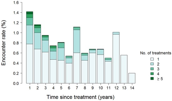 Encounter rates were highest within one year of the most recent treatment and tended to decline with time since treatment (Figure 4).