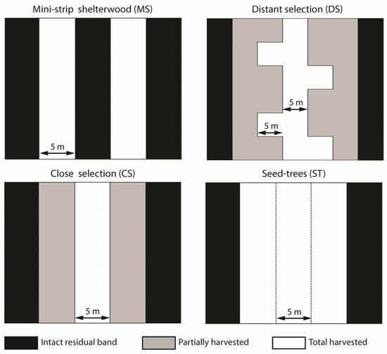 Four cutting treatments were evaluated: Mini-strip shelterwood (MS), distant selection (DS), close selection (CS) and seed-trees (ST) (Table 1). The first three are partial cutting treatments and are variants of uniform shelterwood. This silvicultural system is applied in premature even-aged stands, with the main goal of promoting advanced regeneration though a uniform opening of the canopy [42,43] followed by an overstory removal to produce a new even-aged stand [44]. The main differences between the studied treatments are in the spatial distribution of skidding trails and characteristics of the residual strip (Table 1 and Figure 2). Harvest intensity of the intervention was 50% of basal area for MS, DS and CS, and 75% in ST. MS consists of a succession of 5 m wide cut strips, with 5 m wide residual strips. ST has wider 15 m cut strips with 5 m wide intact residual strips. In the case of CS and DS, trails are set at 20 m and 30 m intervals, respectively, and trees are partially harvested on each side of the trails, at a maximum distance of 5 m from the trail edge (Table 1 and Figure 2). DS has secondary trails transverse to the main operational trails, each separated by 10 m.
