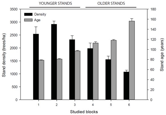 The age analysis determined that all our study sites were even-aged stands, and confirmed that they likely originated from forest fire disturbances. Mean aged ranged between 79 ± 0.39 and 156 ± 4.9 years for the youngest and oldest stands, respectively (Figure 3). Stand age revealed that the low regenerated dense blocks (>2000 trees/ha) correspond to younger stands (<100 years). Younger and older stands were significantly different in terms of density (p < 0.05) and age (p < 0.05). In the younger stands, 100% of trees were in the same 20-year age-class within each block. Older blocks showed more variability in age structure; only 72% of trees were in the same age-class. Mean density values b.c. were 69% higher in younger than older stands (Table 2); volume and basal area values were also between 15% and 25% higher in younger stands.