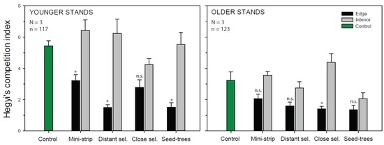 Hegyi’s competition values in the study treatments by stand structure and spatial position in the residual strip 10 years after cutting. Vertical bars show the standard error. * shows significant differences between edge and interior trees by treatment (p < 0.05). n.s. respresents no significant difference.