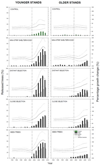 Percentage of growth change (PGC) gave a clearer view of the variations in growth response over time (Figure 5). PGC results with the minimum threshold 100% highlighted the growth model effects, and showed the number of released trees a.c. The structure influenced the radial growth response of residual trees; overall, the mean PGC values of younger stands were more than double older stands a.c. (Figure 5). When tree position was confounded in a stand level average, DS and MS presented the best growth performance in younger stands, and CS in older stands. However, CS and ST were the treatments with lowest growth responses for younger and older stands, respectively, and showed the lowest number of released trees. The control plots in older stands showed stable values during the study period, contrary to younger control plots that displayed a growth increase (13% of trees).