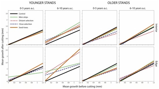 Quantifying tree growth response following partial cutting treatments is essential for the planning of the long-term timber supply within the context of sustainability of forests to conciliate ecosystem management with wood production. However, improvement of tree growth is not the principal goal in shelterwood systems [44], and the potential of residual trees to increase in wood volume is usually not considered [12,43]. Some authors indicated that these treatments could probably stimulate tree growth during the period of regeneration before final cutting [53,54]. The results of our study confirmed this in black spruce stands.