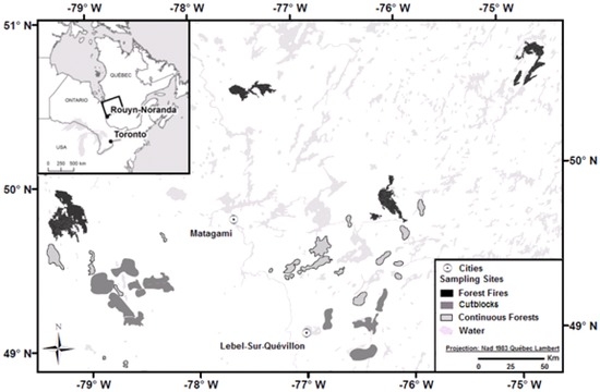 In managed boreal forests, variable retention harvesting is the most frequently suggested technique to retain the structural attributes of original continuous forest stands within a cutblock. Variable retention harvesting leaves living and dead trees and woody debris of the original forest stand in unharvested forest patches, called “post-harvest retention patches” [30,31]. However, it is currently unknown whether the selection of post-harvest residual patches in cutblocks, which is generally based on operational criteria such as the market value of the residual patch, proximity to water bodies, field accessibility and tree age, permits post-harvest residual patches to preserve a variety of structural types similar to those characterizing post-fire residual patches or continuous forest stands [32,33]. In addition, it is also unknown whether the structural characteristics of retention patches are maintained throughout time after harvest, because of their susceptibility to windthrow [34,35]. A comparison of forest structure of post-harvest and post-fire residual patches is required for developing forestry strategies that can maintain biological diversity after harvest.