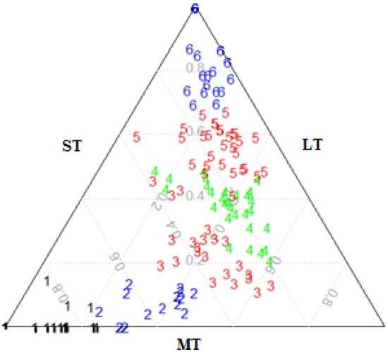 Figure 3. Ternary diagram (ternary plot) representing structural variability within and among structural types (from 1 to 6) by timber size (small timber ST (9 cm > DBH > 13 cm): Left oblique axis; medium timber MT (13 cm > DBH > 17 cm): Horizontal axis, and large timber LT (DBH >17 cm): Right oblique axis).
